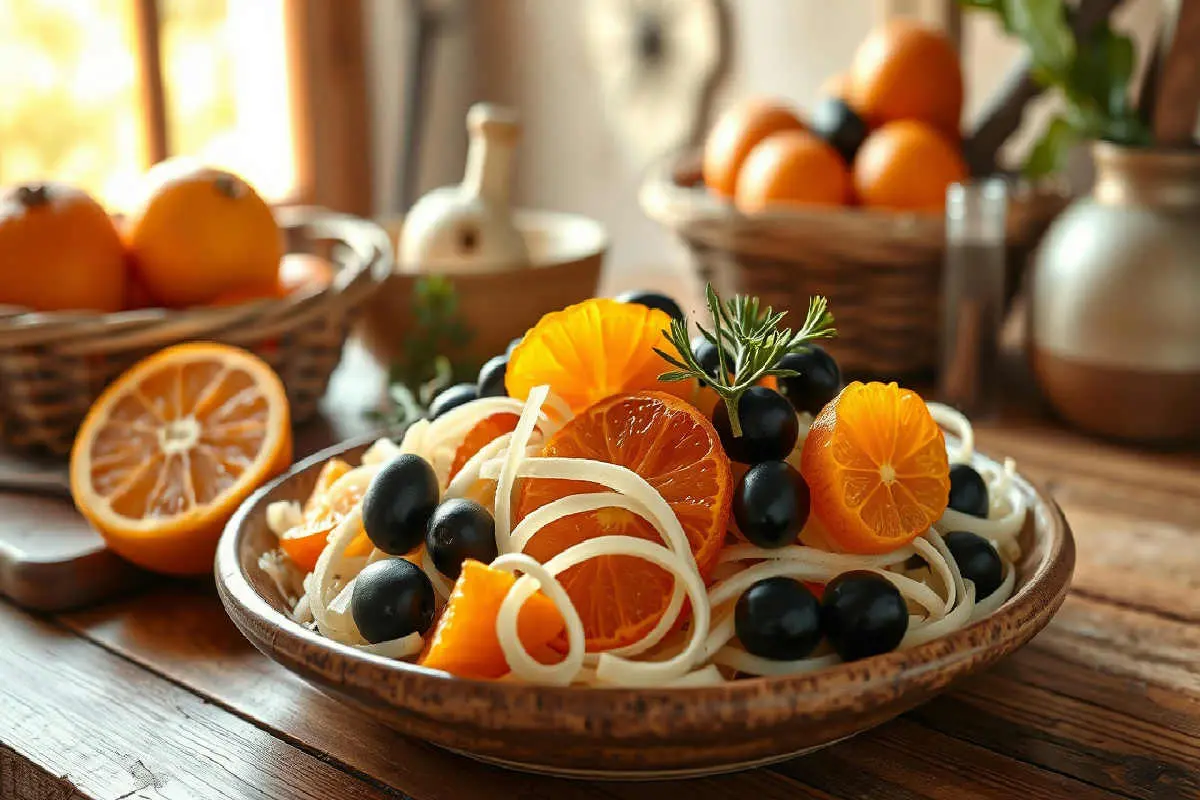 La forza di questa ricetta siciliana sta tutta qui: finocchi croccanti, raccolti nelle campagne di Marsala o nell’entroterra agrigentino; arance bionde (a volte rosse) dalla Piana di Catania, profumate e dal gusto dolce-amaro che si sposa alla perfezione con il resto. Le olive nere, spesso “Nocellara del Belice”, aggiungono quella punta sapida che bilancia la dolcezza degli agrumi.
