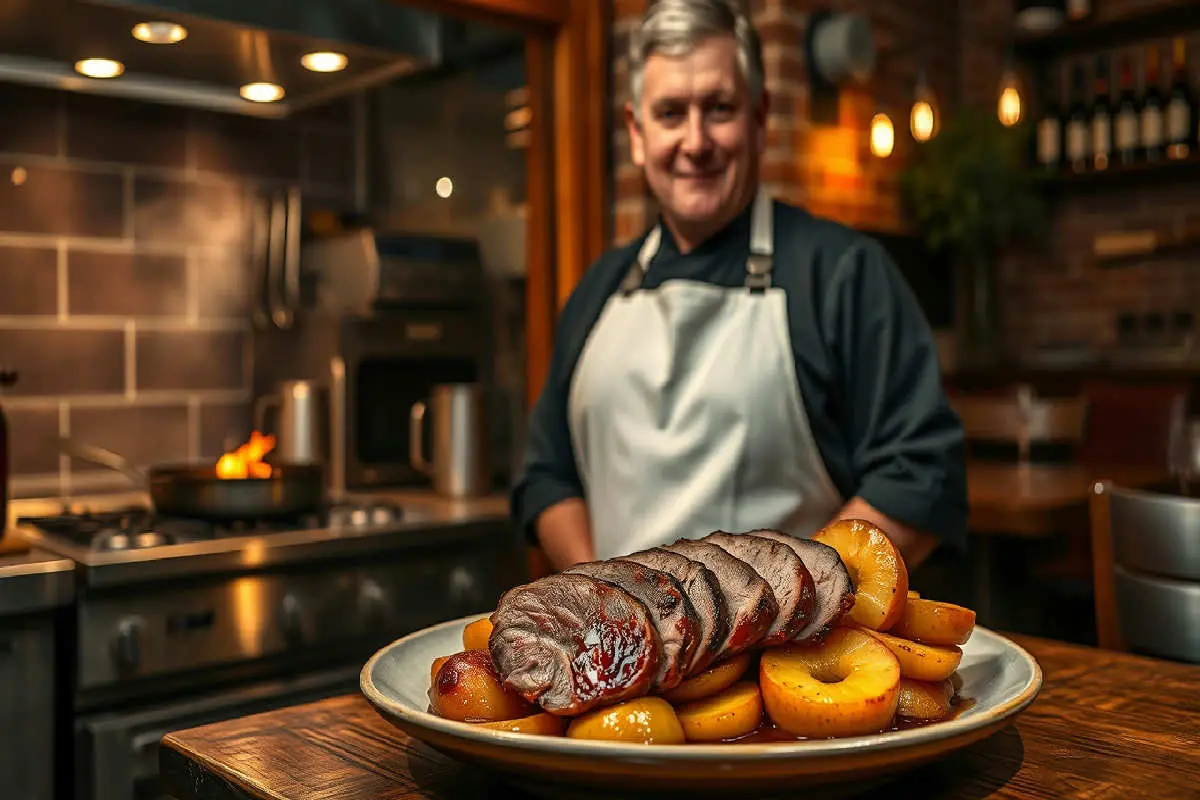Il piatto si serve caldo: il petto tagliato a fette spesse adagiato sopra mele e scalogni rosolati. Qualche goccia del fondo di cottura completa il tutto. Marco sorride: “A volte ci metto un po’ di Cognac in più alla fine – ma solo per chi lo apprezza”.